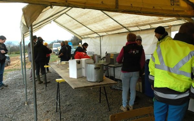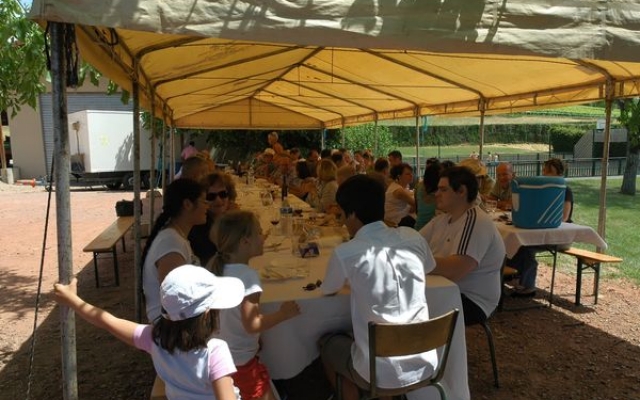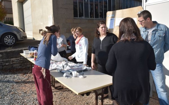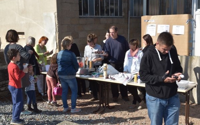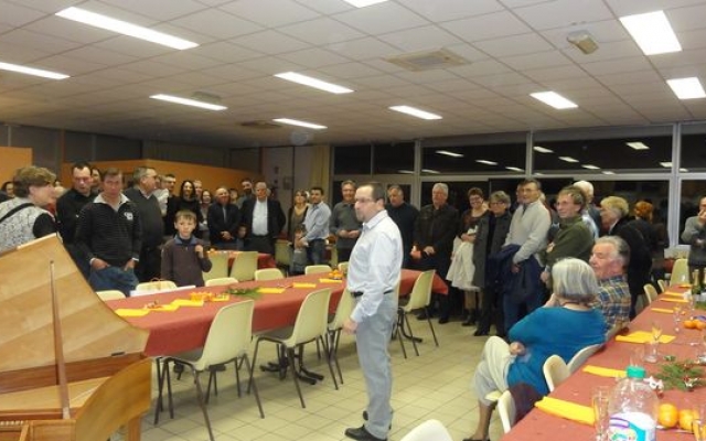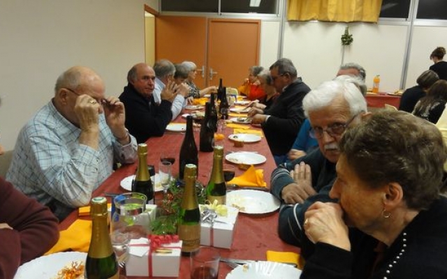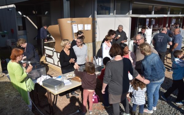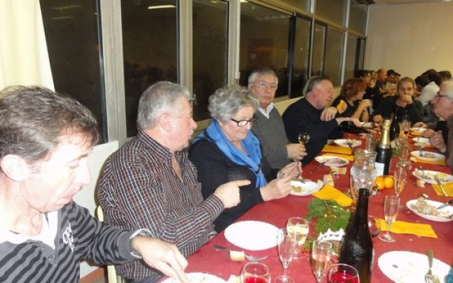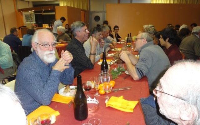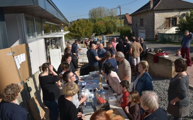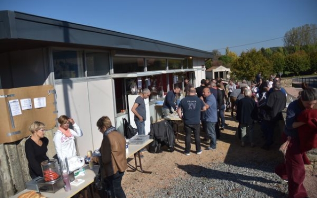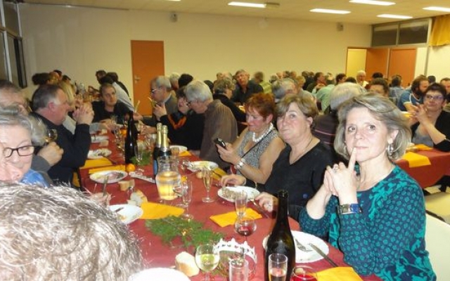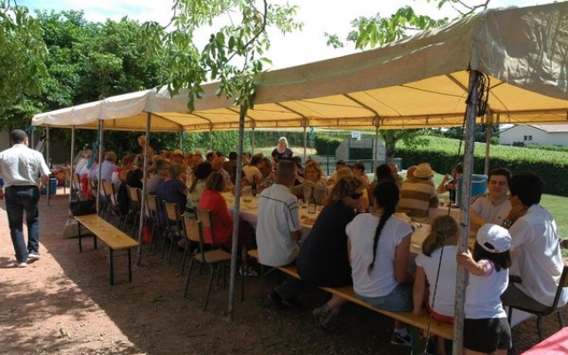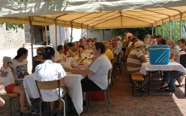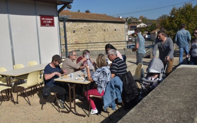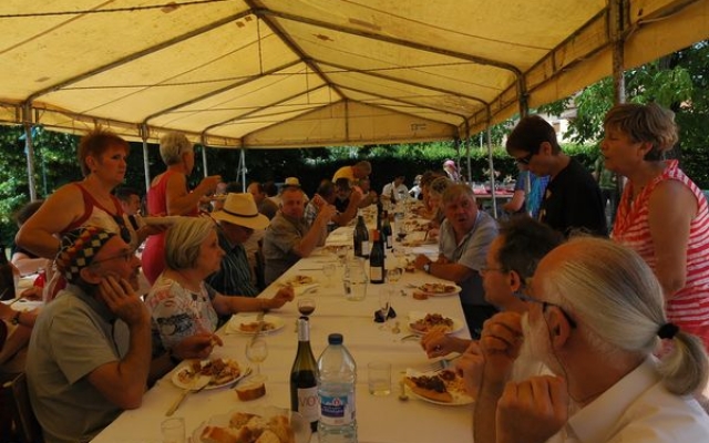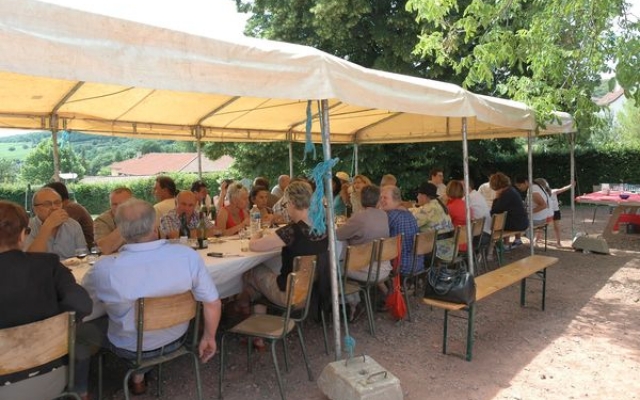 Ambiance chaleureuse et détendue autour de l’apéritif avec des discussions qu’il a fallu interrompre énergiquement pour que chacun prenne place autour des grandes tables abritées sous le chapiteau.
