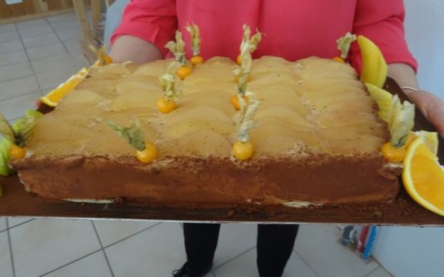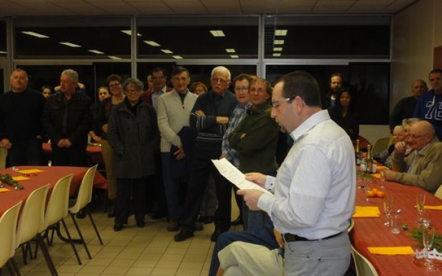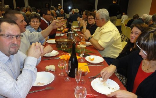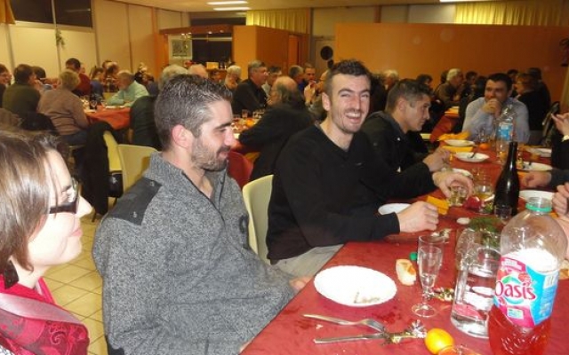 Une pause pour la remise des cocardes aux conscrits des classes en 5, avec un bouquet de roses pour la doyenne du petit groupe et tout le monde reprit sa place pour passer aux fromages, desserts et café.